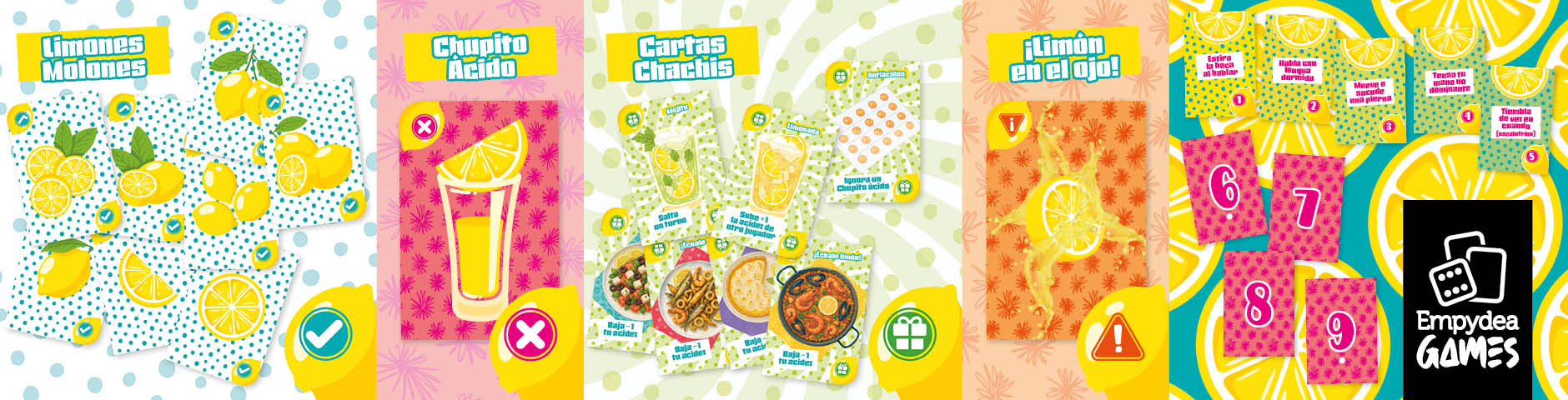 En el centro de la mesa hay un mazo con solo cuatro tipos de cartas: Limones Molones, Chupitos Ácidos, Limón en el Ojo (evento grupal) y Cartas Chachis con efectos especiales. Por turnos, cada jugador revela tres cartas del mazo y resuelve lo que salga… aunque no siempre le guste.