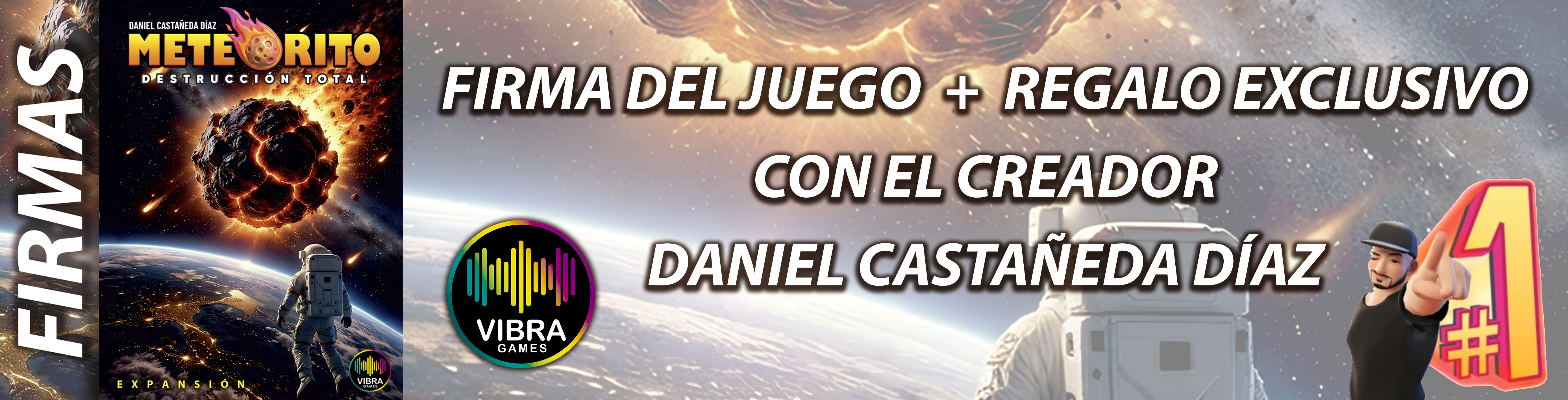 Ven a llevarte firmado Meteorito: Destrucción Total, la expansión más intensa del universo Meteorito, de la mano de su creador Daniel Castañeda Díaz. Durante la feria estaremos firmando copias del juego y, solo por asistir a la firma con tu juego, te regalaremos una carta exclusiva que únicamente podrá conseguirse en este evento. Una oportunidad única para fans del juego, coleccionistas y amantes de los juegos de mesa. ¡No te quedes sin tu copia firmada ni sin la carta especial de feria!