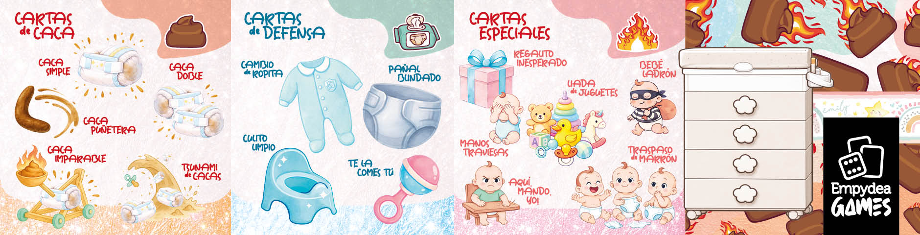 En Cacagedón, la tensión está siempre a la vista: cada jugador tiene su cambiador en el centro de su zona de juego, y encima de él van cayendo las cartas de CACA que le lanzan los demás.