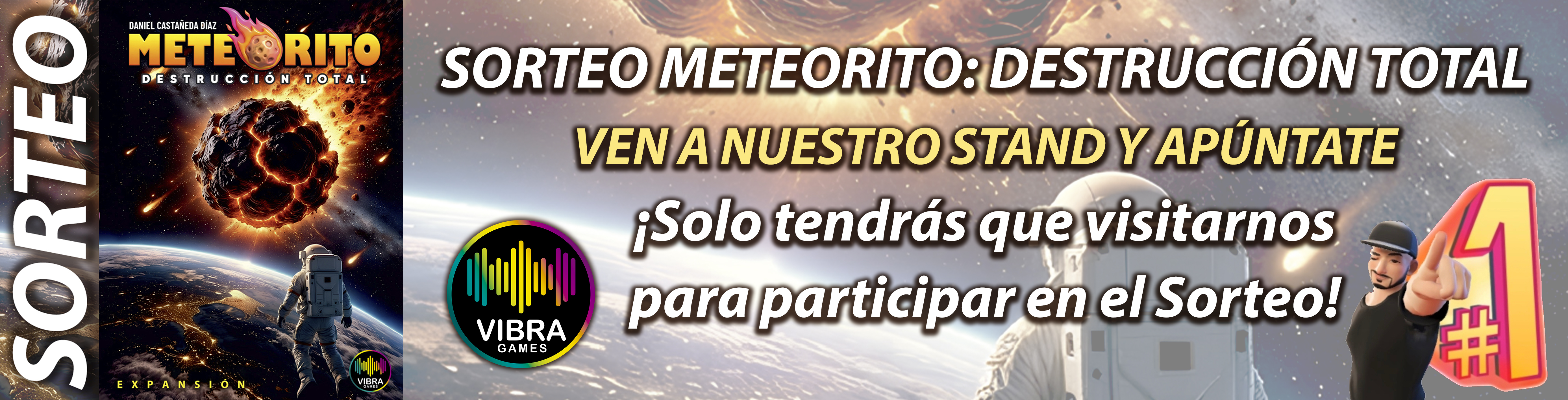Acércate a nuestro stand de Vibra Games, ven a conocernos, prueba el juego, juega unas partidas con nosotros y apúntate al sorteo para tener la oportunidad de ganar una copia de Meteorito: Destrucción Total.
